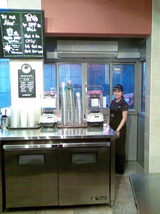 The cashier asked me to spell Tim Horton’s for her and also wondered if they had a website, which I said I presumed there would be. I told her the business started out by serving coffee and donuts. I was going to explain about the addition of bagels, soups, etc. but figured it was probably too much information. Deciding that I needed to take a picture of the drive-through, I asked her to step into the shot.