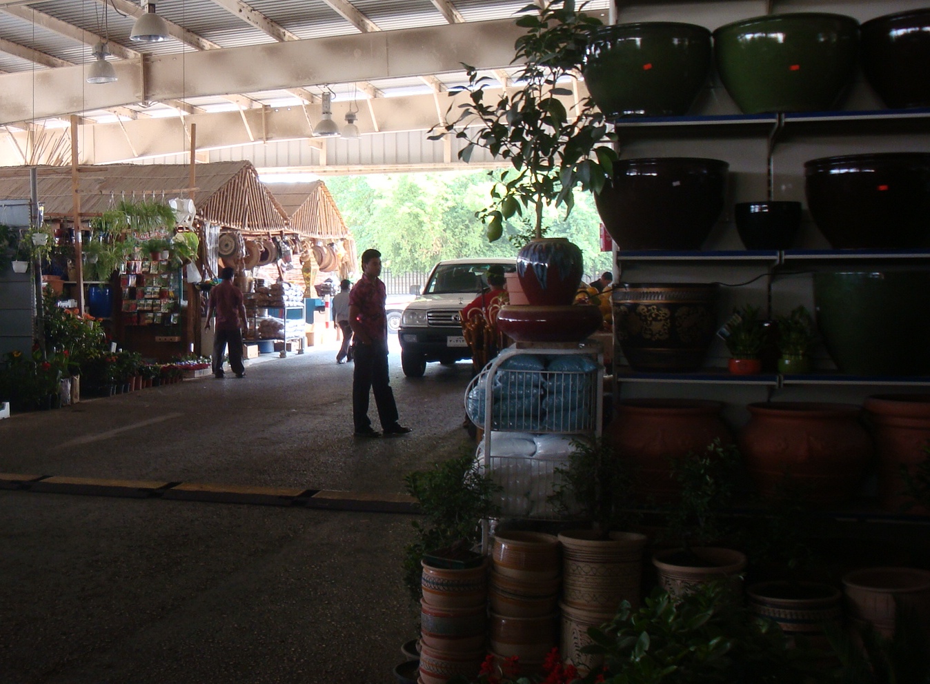 If it’s pots you like there are lots to be found here as well. Or further along on the left are baskets, mats, bamboo fencing. Across from that is a bit of fresh fruit and veg for sale.