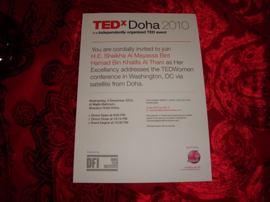 Well, in trying to get this post up it’s getting rather late so I best be off to bed. Mind you I am practising staying up late this week. You see, the days start early here. About 5:30am early, with kids at school by 7:00am. Which usually means bedtime is about 9:30 or 10:00pm. But I have a lucky ticket to attend the TEDxDoha 2010 TEDWomen conference here (via satellite from Washington, DC).